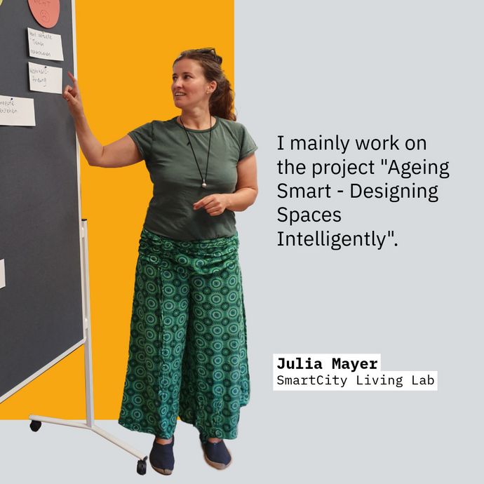 My name is Julia Mayer, I studied mathematics in Mainz and have been working at DFKI for almost three years now. I mainly work on the project "Ageing Smart - Designing Spaces Intelligently". In this project, we are developing a decision support system to help municipal stakeholders meet the challenges of demographic change. One approach is to visualize the reachability of doctors with different means of traffic and in different residential areas. In areas where sufficient healthcare provision is not ensured, we want to highlight possible recommendations for action and their impact.