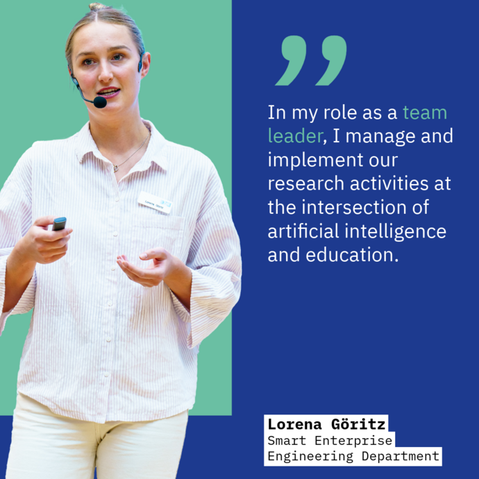 My name is Lorena Göritz, and I have been working as a researcher and team leader at DFKI for three years. I have a bachelor's degree in business psychology, a master's degree in psychology, and I am currently completing my Ph.D. in information systems. In my role as a team leader, I manage and implement our research activities at the intersection of artificial intelligence and education.