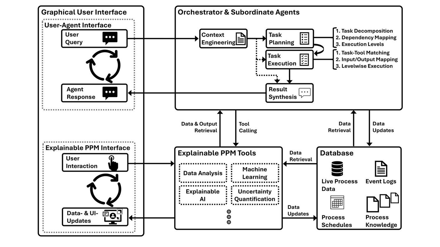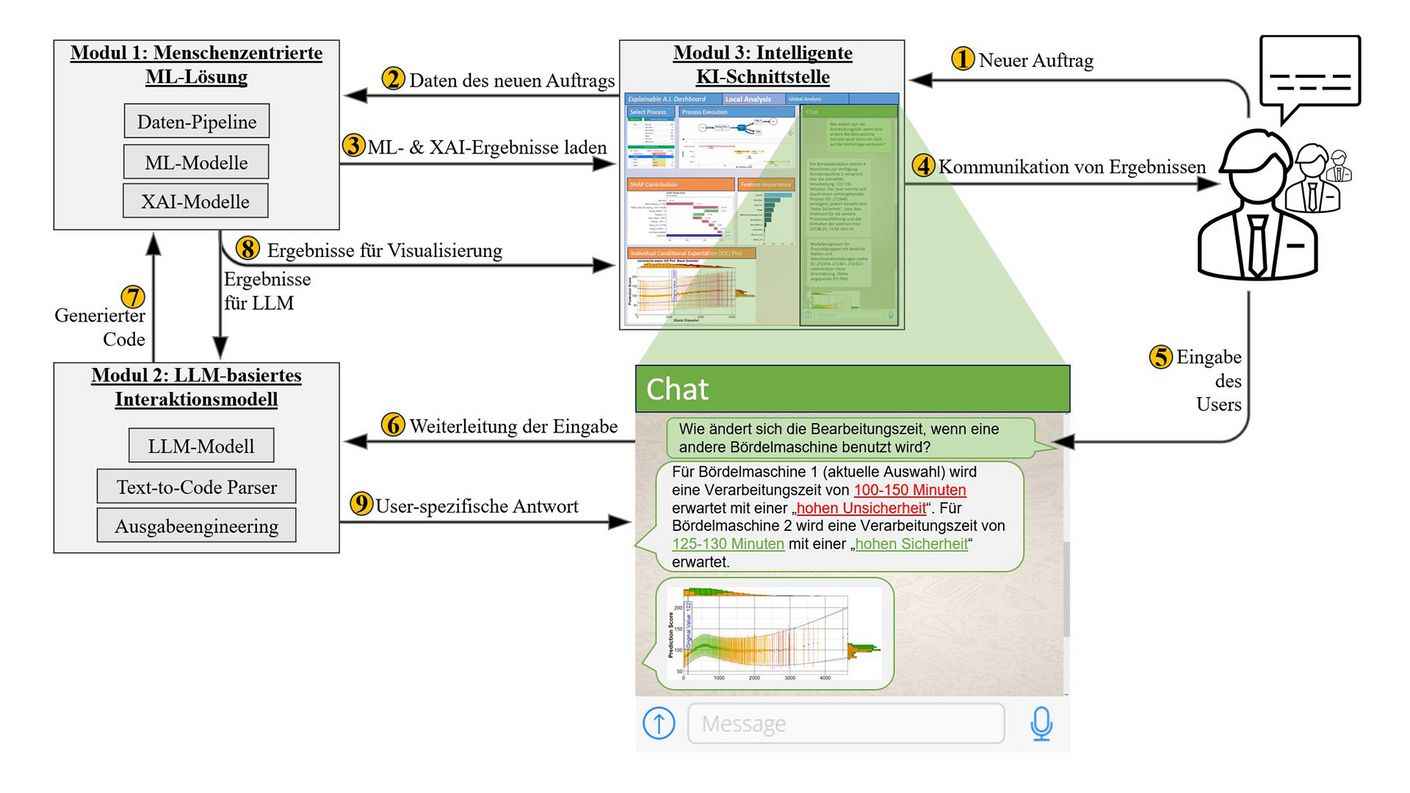 The core of the approach is an agent-based solution that enables users to interact with the underlying AI systems in natural language. They can ask questions, request explanations, analyze uncertainties, and understand or specifically adjust model decisions. The developed architecture not only makes AI systems in process planning and execution explainable but also actively involves them in a mutual dialogue. Decisions can be discussed transparently, alternatives can be compared, and models can be optimized iteratively.
