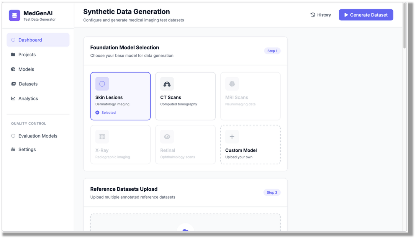 MedGenAI addresses core challenges in trustworthy medical AI: data protection through synthetic data, transparency via configurable parameters, and reproducibility for scientific validation. The demonstrator integrates with the DFKI competence field Trusted AI for Healthcare and supports developers in creating robust, ethically secure systems in the face of scarce real training data.
