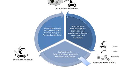 Der Ansatz: Das Projekt Q-Rock implementiert Verfahren, die es dem Roboter erlauben ausgehend von seiner Hardwarekonfiguration die ihm zur Verfügung stehenden Fertigkeiten zu erforschen. Hierzu werden semantisch beschriebene Softwarebausteine erzeugt, die Evolvieren, Lernen aber auch Schlussfolgern über mögliche Topologien dieser Bausteine ausgehend von der Aktorik und Sensorik des Roboters erlauben. Es wird ein Lernframework konzipiert und implementiert, in dem der Roboter diese ihm durch seine Hardware gegebenen grundlegenden Fertigkeiten (bspw. seine Kinematik) erforscht Im nächsten Schritt werden die erlernten Fertigkeiten des Roboters in den Kontext einer Anwendung gebracht. Schließlich wird eine bidirektionale Abbildung zwischen Hardware und deliberativem Verhalten erzeugt. Hier ist zum einen das Ziel ausgehend von modelliertem Verhalten eines Roboters durch strukturelles Schlussfolgern die notwendige Hardwarekonfiguration zu erhalten, um dieses Verhalten ausführen zu können. Zum anderen soll durch Schlussfolgern über Hardware und Fähigkeiten evaluiert werden, zu welchen Verhalten diese Hardware in der Lage ist.
