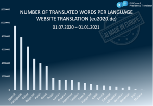 The majority of the website translations stem from the website of Germany’s Presidency of the Council of the EU, which can be translated into any of the 24 official EU languages with one simple click. Translations into French and English are provided by professional translators, while the remaining 22 languages are covered by the German EU Council Presidency Translator. The five most frequently used languages for website translation are Spanish, Portuguese, Italian, Bulgarian and Polish.