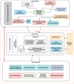 © CORTEX²Dafür haben die Forschenden auf das Produkt Rainbow von Alcatel Lucent Enterprise aufgebaut, ein kommerzielles Tool für Videokonferenzen, vergleichbar mit Anwendungen wie Teams und Zoom. Diverse Funktionen des Rainbow Cores wurden dann in ein funktionales Framework für XR-Anwendungen überführt. Dieses wiederum stellt aus einem Baukasten von Funktionen und Tools eine Vielzahl an KI-Anwendungen zur Verfügung, um die individuellen Bedarfe der Anwender zu erfüllen: